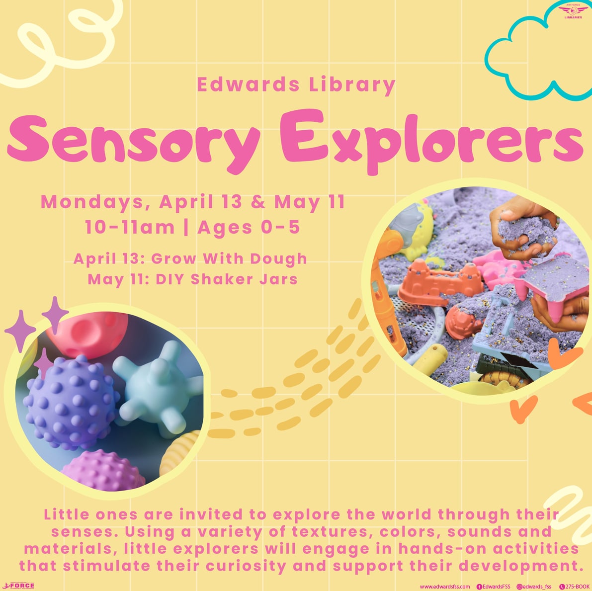 Little ones are invited to explore the world through their senses with Edwards Library!ย Using a variety of textures, colors, sounds and materials, little explorers will engage in hands-on activities that will stimulate their curiosity and support their development.