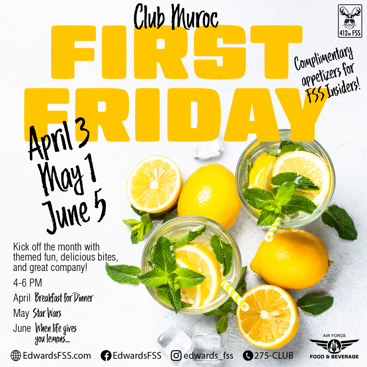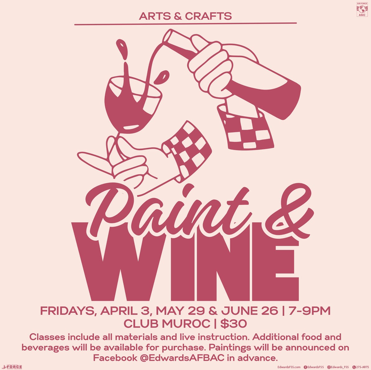 2 events,Clock out and head over!Join us for our next round of First Fridays. Enjoy fun themes, food, and more!4 – 6 pmApril 3: Breakfast for DinnerMay 1: Star WarsJune 5: […] Join us for Paint & Wine Night on Fridays at Club Muroc! Friday, April 3 | May 29 | June 26 | 7 – 9 pm $30 (all supplies & […] |